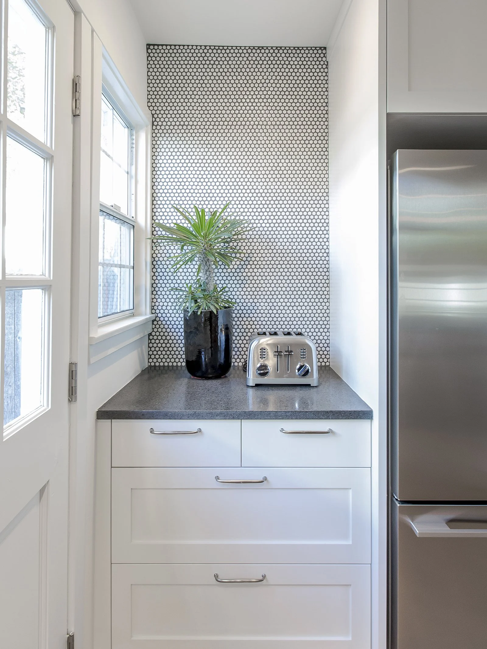 Challenged by previous misguided remodels, we redesigned a highly segmented interior to create a contemporary and cool residence for a pair of young, first-time home buyers. At the heart of the newly open plan is a custom, large-scale kitchen island designed with friends and a growing family in mind. The kitchen flows easily into both living and dining areas, and the material palette throughout further brightens and modernizes the 50’s era residence.