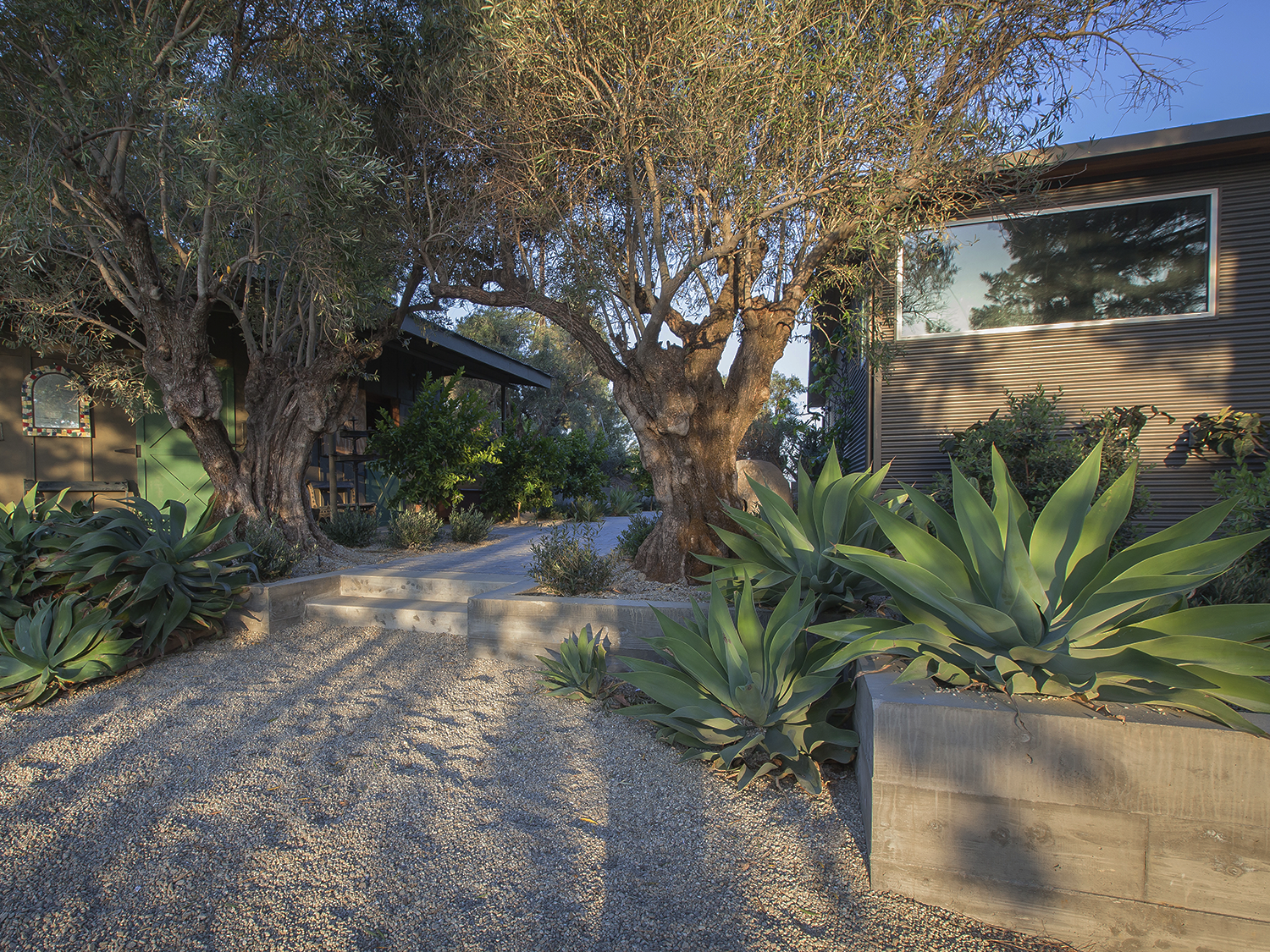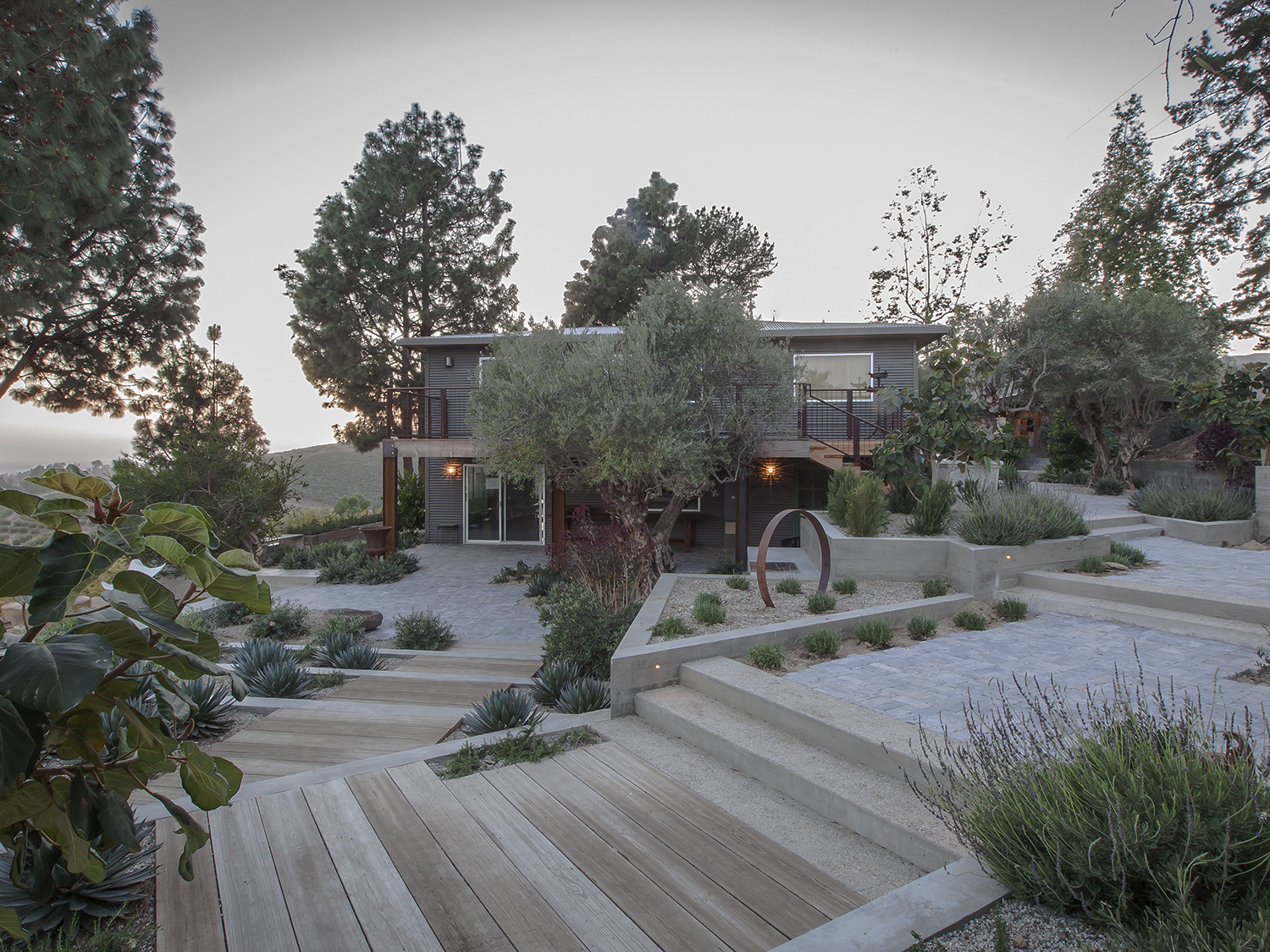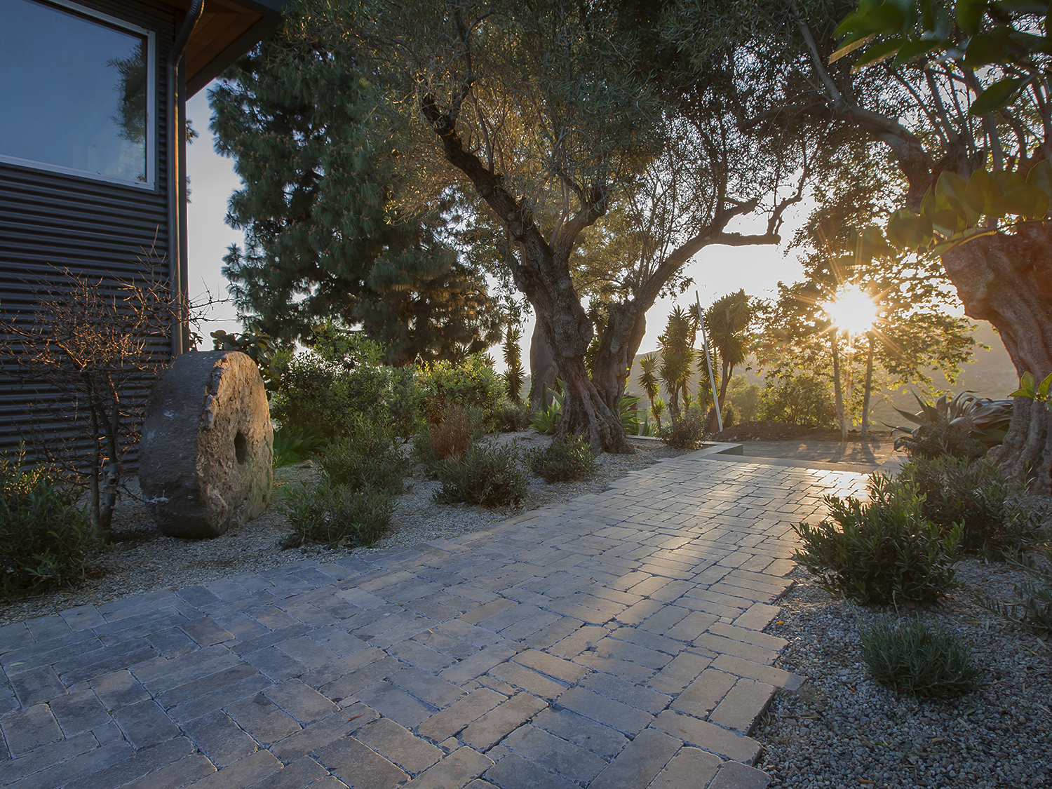 The plantings feature field-dug olive trees from California’s central valley and other native and drought-tolerant species, creating a cool palette that plays well against a backdrop of french limestone pavers and pea-gravel. An Argentinean grill is central to casual outdoor gatherings that invite relaxation in a truly idyllic country retreat.